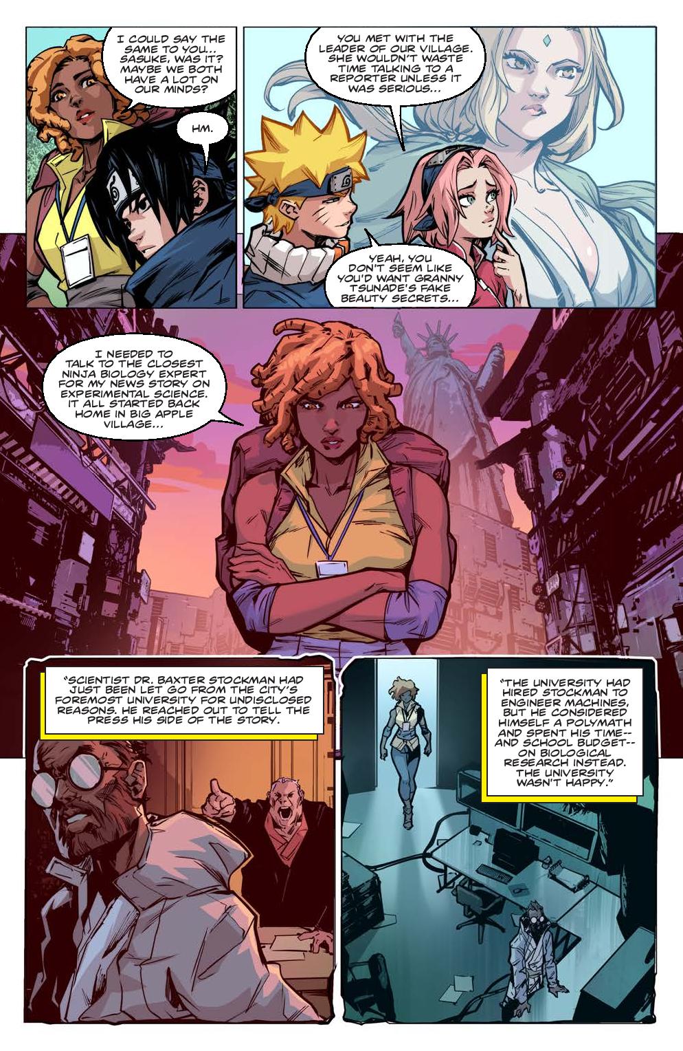 When teenage reporter April O’Neil has a clandestine meeting with Tsunade, the leader of the Hidden Leaf Village, it garners the attention of Naruto, Sasuke, Sakura, and Kakashi. They aren’t the only ones who are wondering what the two women were discussing, though. The sinister Foot Clan have their own interest in April’s visit, as they think she might hold the valuable information on mutation research being conducted by the scientist Baxter Stockman. With April caught between the forces of the Hidden Leaf Village and the Foot Clan, it can’t be long before the Teenage Mutant Ninja Turtles show up to lend her a hand!