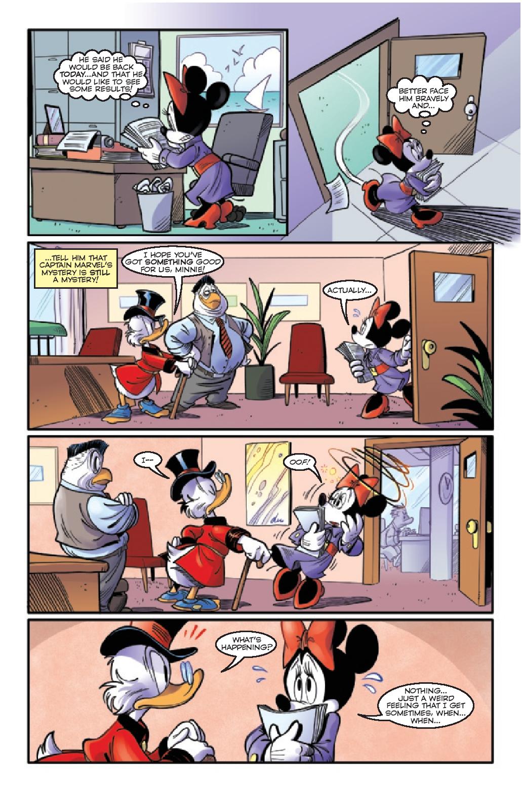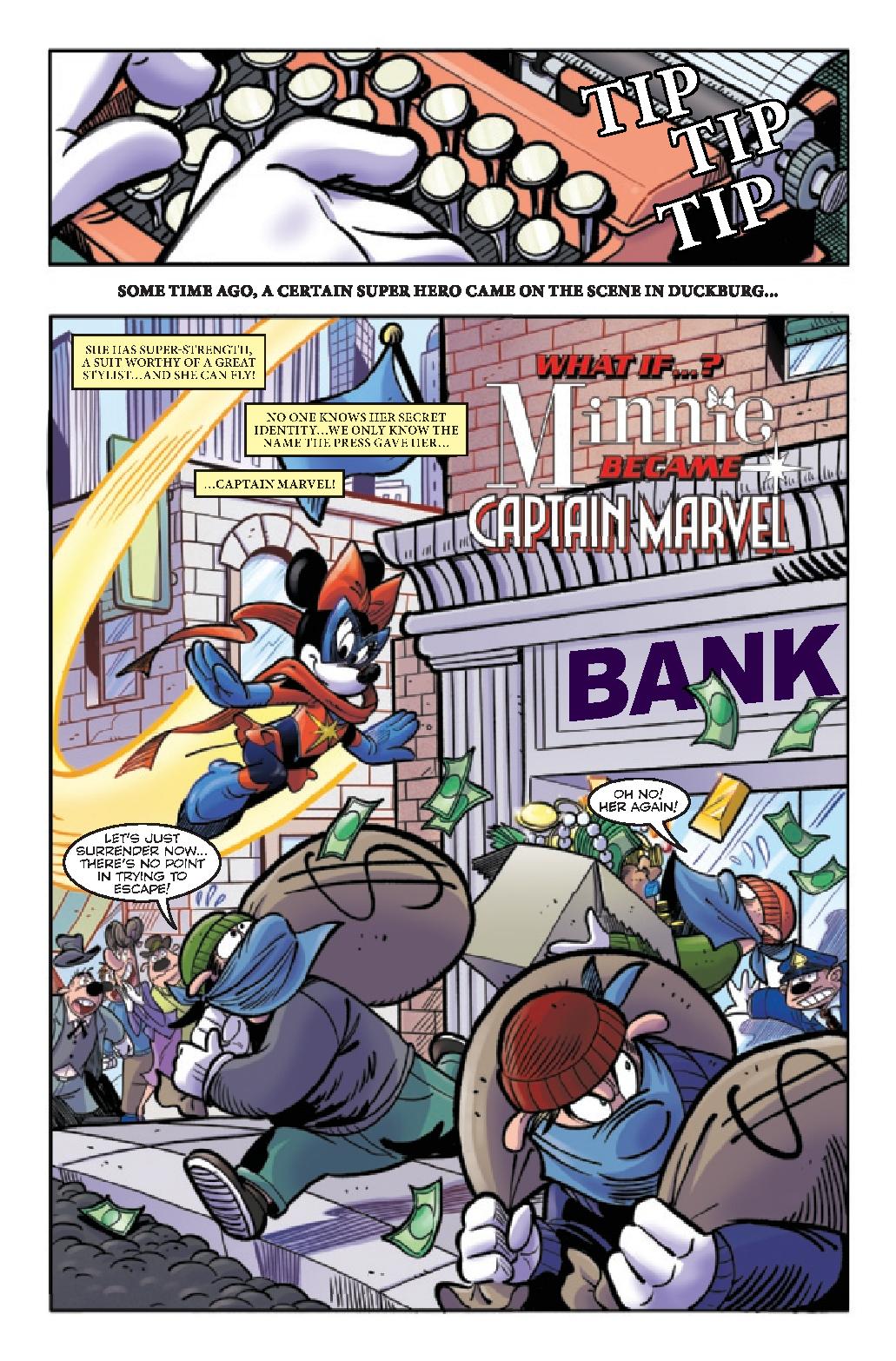 Inspired by MS. MARVEL VOL. 1 #1-4, our story finds The Chronicle newspaper reporter MINNIE MOUSE tasked with an exposé on a new hero on the scene in Duckburg, CAPTAIN MARVEL! But PEG LEG PETE – SCORPION complicates her plans with an attack on the Chronicle building! To make matters worse, JOHN D. ROCKERDUCK and the BEAGLE BOYS attack SCROOGE McDUCK’S money bin, and when Captain Marvel shows up to stop them, Minnie discovers an incredible secret about her past! What is Minnie’s connection to Duckburg’s sensational new hero, Captain Marvel?
