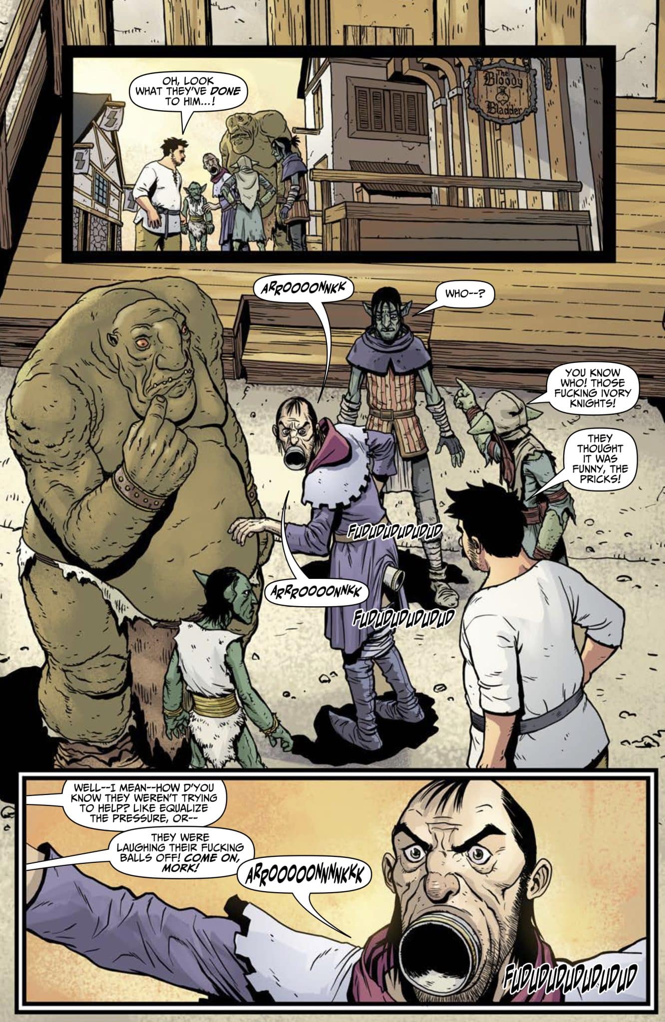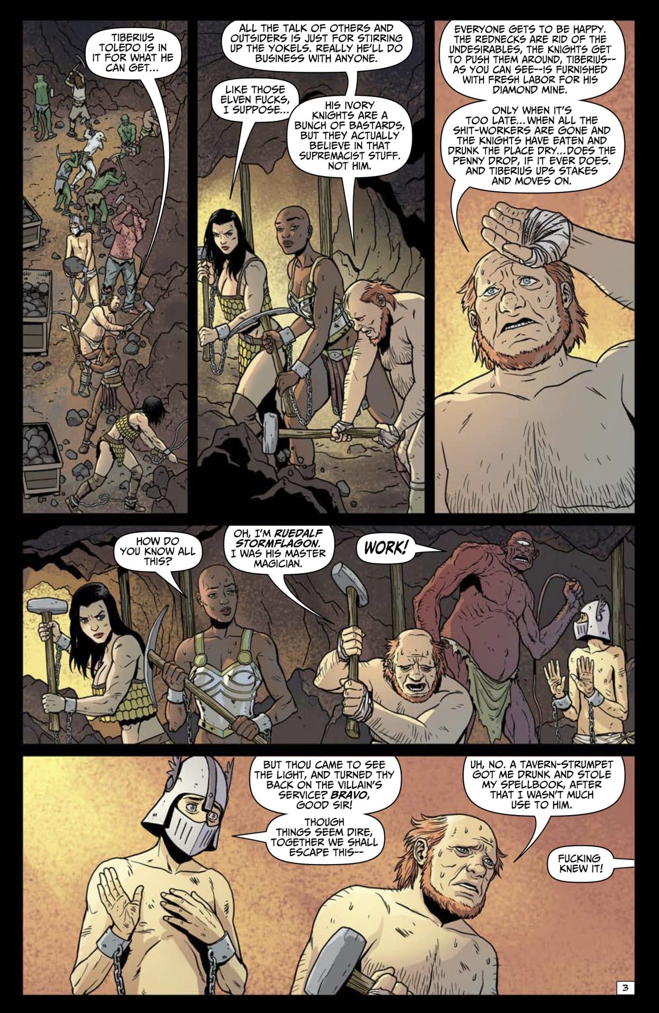 More sword-and-social-satire action from the acclaimed Ennis/Burrows team! In the depths of Tiberius Toledo’s diamond mine, Babs and her allies toil in captivity, until an escape plan forms—involving the libidinous Head Guard and a shocking sacrifice of virtue!