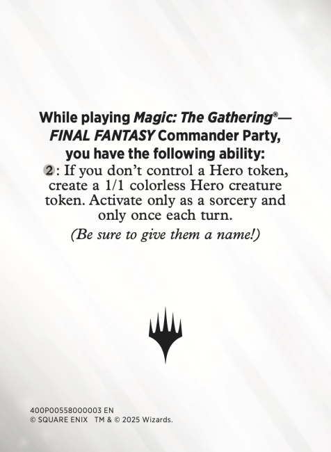 The Final Fantasy Commander Parties will feature a flavorful mechanics twist to Commander gameplay. Players will be able to create a Hero token during games that they can use to complete quests, earn reward triggers, and possibly win a game. They will have a static ability in the game that allows them to pay two colorless mana to create a 1/1 Hero creature token. If they control the Hero during the End Step, they can use that to complete a Quest and trigger a random reward off the Rewards card. If the player completes all five Quests, they win the game.