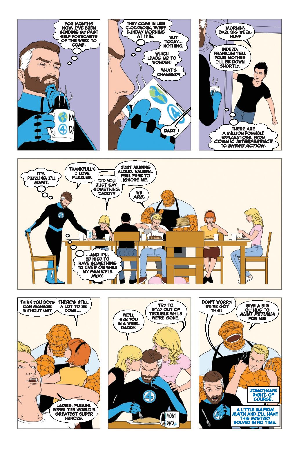 The celebration of Marvel’s First Family continues, with three all-new tales from Marvel’s finest talents! Jonathan Hickman and Dustin Weaver reveal just what happens to the cosmic quartet when Friday the 13th rolls around. John Tyler Christopher spins a tale about Reed Richards receiving messages from himself in the future. And Mark Buckingham tells the story of two of Doctor Doom’s underlings who have been made responsible for the master’s killer robot, the Seeker!