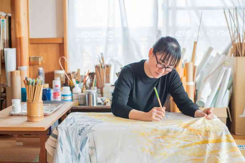 Born as the eldest daughter of a family that runs a kimono shop, she began studying Nagoya Yuzen dyeing in 1996 as an apprentice to a traditional craftsperson in Nagoya.