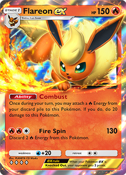 Sylveon ex’s Happy Ribbon Ability allows you to draw two cards when you play it from your hand to evolve one of your Pokémon—you can use this Ability in tandem with a Support card such as Professor’s Research to draw even more cards for that turn. With no Psychic Energy in the deck, Sylveon ex should stay safe on the Bench, and you can focus on powering up Flareon ex with Energy instead. Finally, make sure to attach at least one Energy to our closer, Flareon ex, on the turn before you plan on moving it to the Active Spot. Flareon ex should come into play after another one of your Pokémon retreats or is Knocked Out—this puts Energy into our discard pile, which we need for Flareon’s Combust Ability. Between Combust and your Energy Zone attachments, Flareon ex can do 130 damage using Fire Spin, with potential to do even more using Eevee Bag and Red.