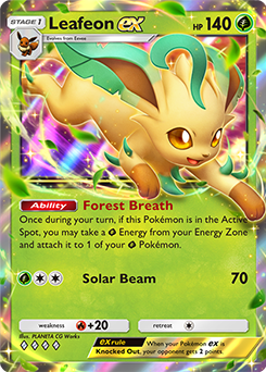 Game plan: Ideally, Leafeon ex will lead the charge in the Active Spot, since its Forest Breath Ability works only when Leafeon ex is your Active Pokémon. Forest Breath allows you to take one Grass Energy from your Energy Zone and attach it to one of your Grass Pokémon—even when you’re running an Energy Zone with only Fire Energy. You’ll want to use it to power up Leafeon ex and Leafeon. While Leafeon won’t typically be your primary attacker, it’s a good Pokémon to use to bypass the Electric-type Oricorio’s Safeguard Ability, which protects it against attacks from Pokémon ex. Leafeon’s Leafy Cyclone attack can Knock Out an Oricorio holding a Giant Cape in one hit, clearing a path for Pokémon ex to attack.