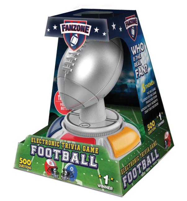 This electronic game, shaped like the Lombardi trophy, offers football fans 500 questions to answer true or false. The game is moderated by virtual game masters that explain the rules, manage the game, and deliver the questions across five categories: The Big Game, Legends of the Game, Franchise Fever, Monday Night Moments, and Draft Day Decisions. The game has two different game modes, one for ages 7 and up and one for ages 14 and up. Fanzone: Electronic Football Trivia Game supports up to five players and plays in 15 minutes.