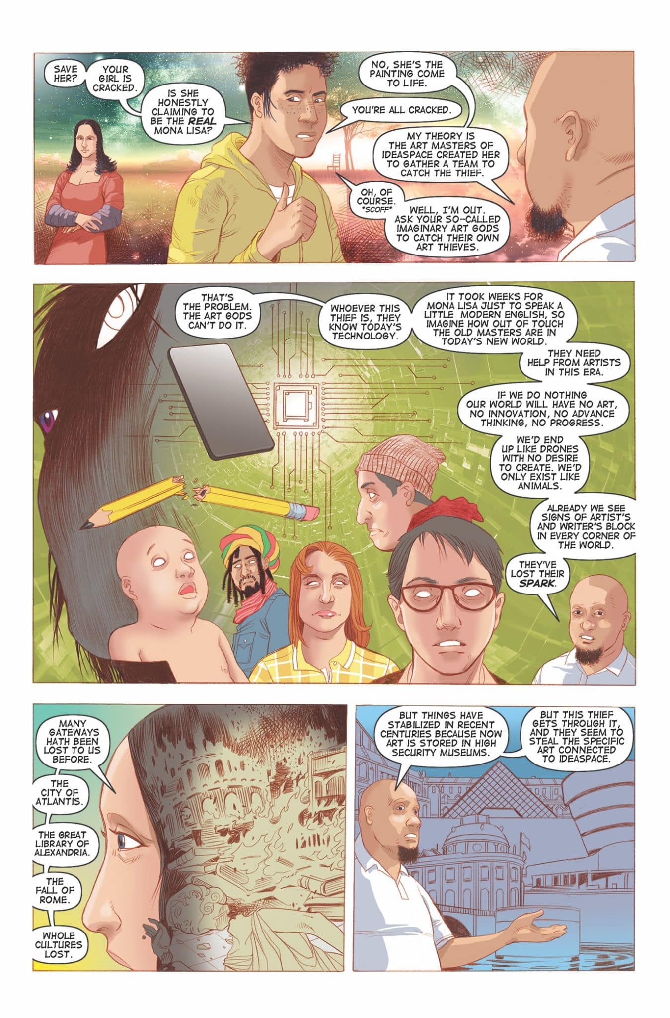 All human art and creativity comes from an ancient power source, amplified by magical gateways all over the world, but now a sentient AI is closing the gateways in order to control all of the world’s creative arts. As humanity loses the ability to create art, the last gateway brings the Mona Lisa to life so she can form a team of artists to steal the gateway of creativity back from the AI. Three artists are given magical abilities that transform their art into weapons: a graffiti artist, a film FX artist, and a comic book artist. Together they plan an elaborate heist to save the last gateway of creativity. Imagine Now You See Me by way of The Matrix and you’re on the right track.