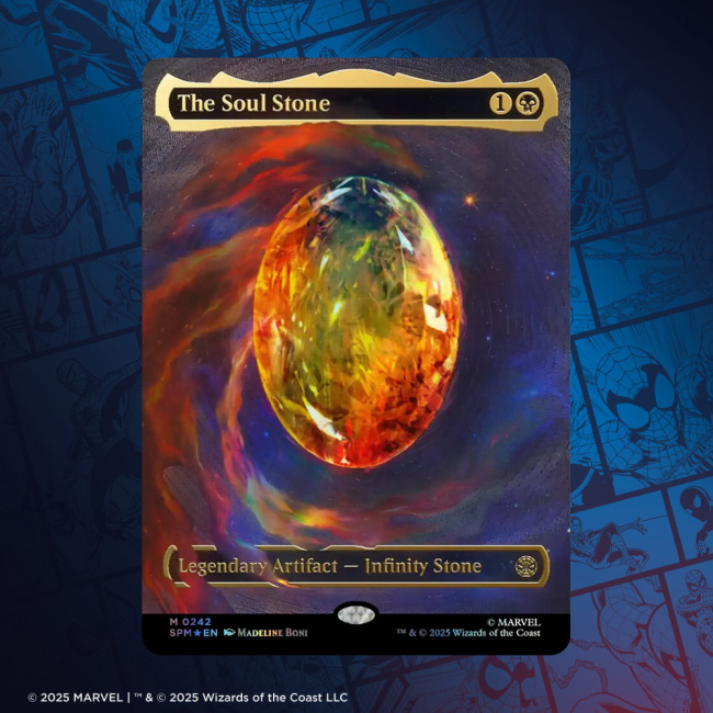 A cosmic-treatment The Soul Stone card from the Magic: The Gathering – Marvel’s Spider-Man set has sold for $19,500 on eBay days after another Soul Stone sold for $15,000.
