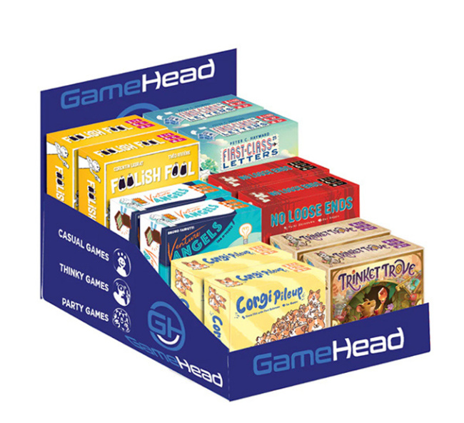 GameHead is the evolution of the GamerMats brand, which was recently rebranded to expand into the realm of the publishing games as well as playmats (see “GameHead“). Their current board game line, which sold like hotcakes at Gen Con 2025, consists of six small box games: Foolish Fool, Corgi Pileup, No Loose Ends, First-Class Letters, Venture Angels, and Trinket Trove. Each of these games retail for $20.00, and come in a countertop display with two of each of the six games. Their accessories lines, the GamerMats side of the business, still include playmats, deskmats, and playmat tubes.