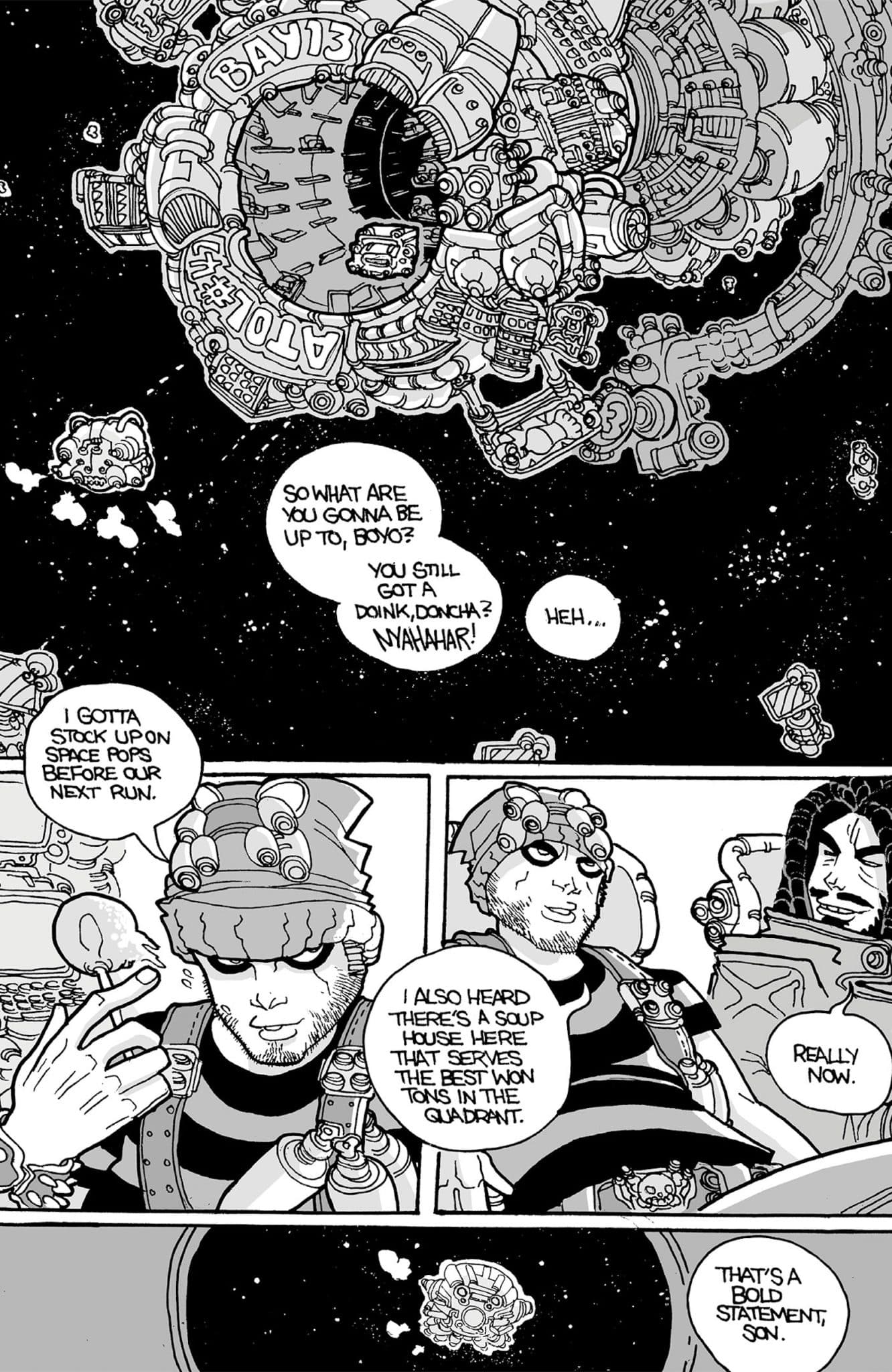 Space! Clones! Aliens! Noodles! Join Johnny Boyo, a former culinary student as he seeks out extraordinary adventure and intergalactic entrees as a cosmic truck driver along with his troublesome pal Deacon.