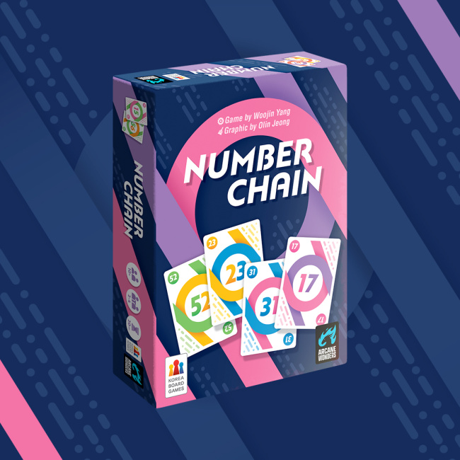 In Number Chain, created by designer Woojin Yang, the goal is to string together number cards by matching the ones digit to the other card’s tens digit, chaining them one by one.  The goal is to get rid of all of their cards before the other players can, and players can play all of the cards they can successfully chain together each turn in pursuit of that goal.  Players earn penalties based on the value of the cards they have left at the end of each hand, and the one with the fewest points after three hands wins the game.  The design uses a system of color-coding to help players make matches on the cards to streamline gameplay.