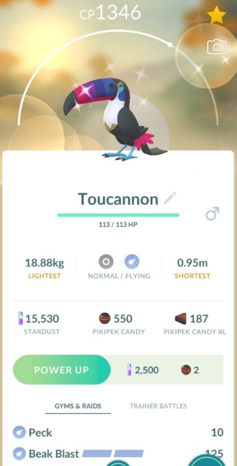 Pokémon GO screenshot of Shiny Toucannon that knows the Pokémon GO Community Day exclusive move Beak Blast