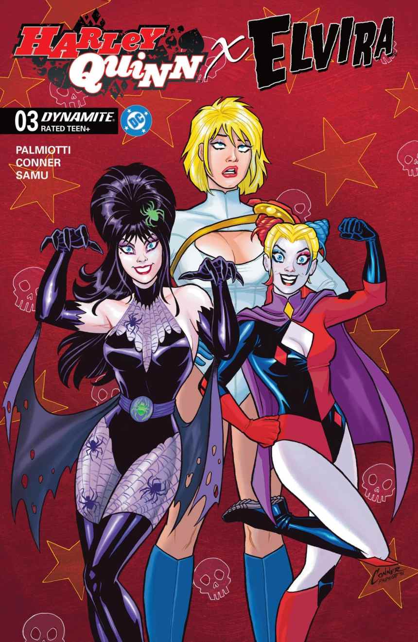 Shameless Harley Quinn enablers AMANDA CONNER and JIMMY PALMIOTTI raise the stakes in their third issue of Harley Quinn X Elvira, with Conner continuing to deliver double-barreled cover action — together with JOSEPH MICHAEL LINSNER, CHAD HARDIN, and BEN CALDWELL — as well as supplementing JUAN SAMU’s inimitable interior art!
