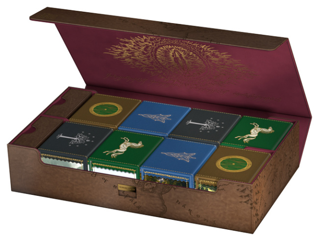 These deck boxes can be stored in the brand-new Places of Middle-earth Omnihive. This storage box can hold up to 1000 double-sleeved cards and features an Eye of Sauron embossed in gold on the inside cover of the box. It will retail for $99.99. The line also has two playmats, one standard and one large.