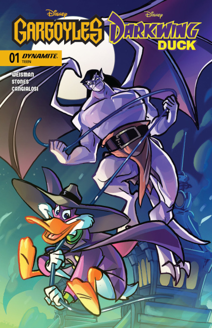 Gargoyles creator Greg Weisman and Darkwing Duck creator Tad Stones join forces with artist Ciro Cangialosi to bring the Defenders of St. Canard and the Manhattan Clan together for an adventure so epic that no single continuity could contain it!  After contacting a wary Morgana Macawber through her magic mirror, the scheming Demona whisks the uncooperative sorceress out of St. Canard and into her New York City lair, where she proceeds to grill Morgana for the location of a certain mystical tome with enough eldritch energy to allow Demona to finally conquer the world.  Darkwing Duck, of course, isn’t about to take this lying down.  As soon as he learns about Morgana’s abduction, DW and his stalwart sidekick Launchpad McQuack are in the air, racing towards the Big Apple to rescue his avian amour.  But will the Terror That Flaps in the Night be able to handle the City That Never Sleeps – not to mention the stone guardians who protect it?  Find out in the action-packed first issue of Gargoyles/Darkwing Duck, featuring covers by Tad Stones, Ciro Cangialosi, Declan Shalvey, and Ivan Bigarella – as well as an exclusive Blind Bag Variant!