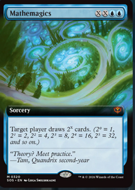 WotC decided to up the ante a bit on the use of mathematics in the Secrets of Strixhaven set by adding exponents into card text as a game mechanic. They spoiled the Mathemagics card, which allows a target player to draw 2X cards. It is unclear whether or not this is the only card in the set that uses exponents as part of its card text. However, it is clear that Commander players may let out an audible groan at the tabletop if Mathemagics ever gets cast as part of a High Tide combo.