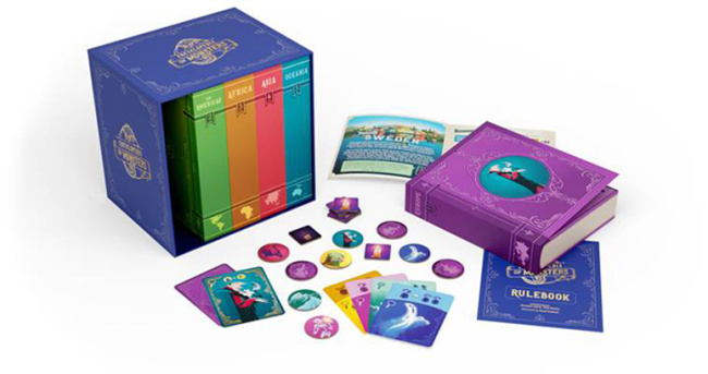 In Encyclopedia of Monsters, players travel the continents of the world to discover different monsters and spirits. On their turn, players play a monster card and use that monster’s power to find a matching token for the card. If the player finds the match, the monster card remains visible in the field of play; if not, it goes back into hiding. The game comes with five volumes to play through, representing five continents in the world. Players will need to rely on teamwork and memory to find all the monsters and win.