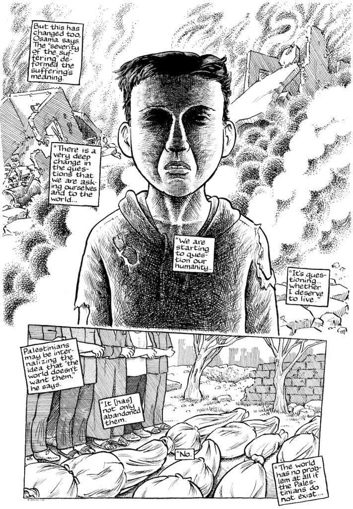 Requiem for Gaza, like their New York Times best seller Days of Destruction, Days of Revolt, combines comics and single images drawn by Sacco within the narrative written by Hedges. Hedges’ vivid prose and Sacco’s visceral images complement each other and together paint a portrait of dignity and suffering under genocide. The collective power of the individual stories that chronicle the first day of the genocide, the forced evacuation of homes, the targeted assassinations, the false hopes engendered by ceasefires, the dislocation and alienation of exile, the brutal killing and hasty burial of family members, and the humiliation of living under tarps without clean food and water bring every aspect of the genocide to life. Set against this horror are stories of self-sacrifice and compassion that show how Palestinians not only clung to their humanity, but morally triumphed over their killers.