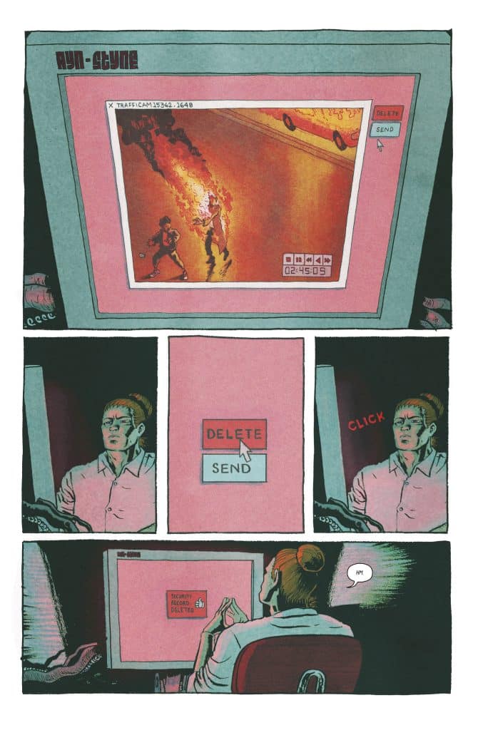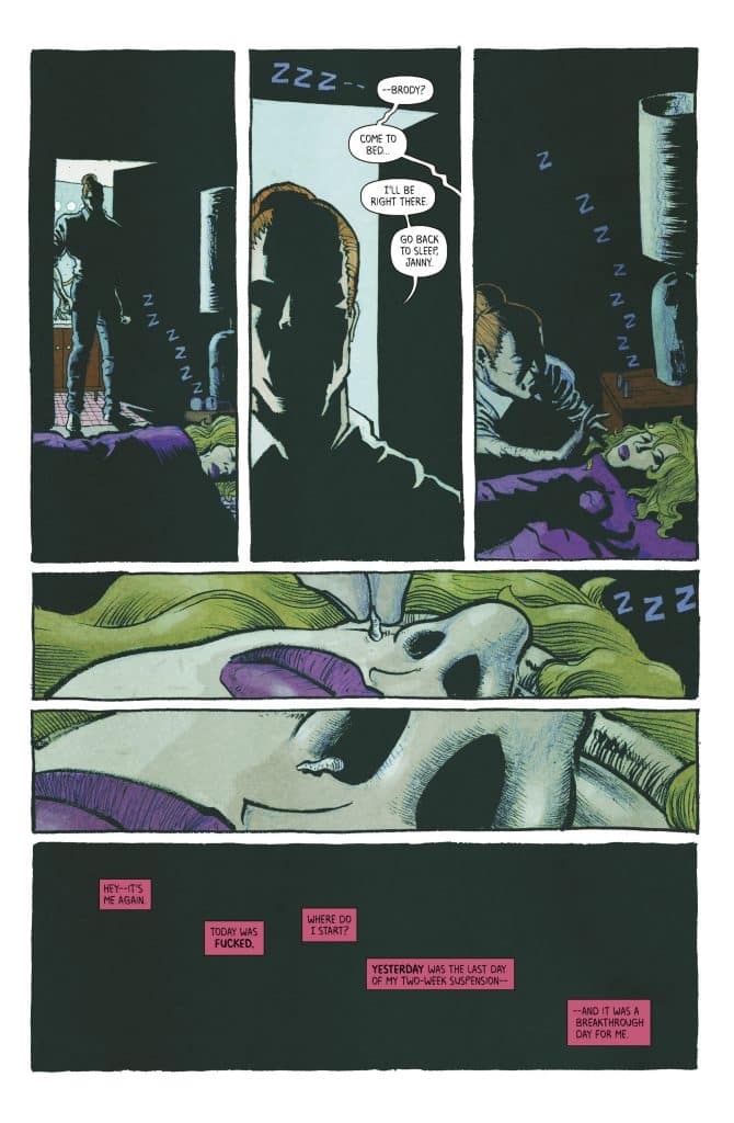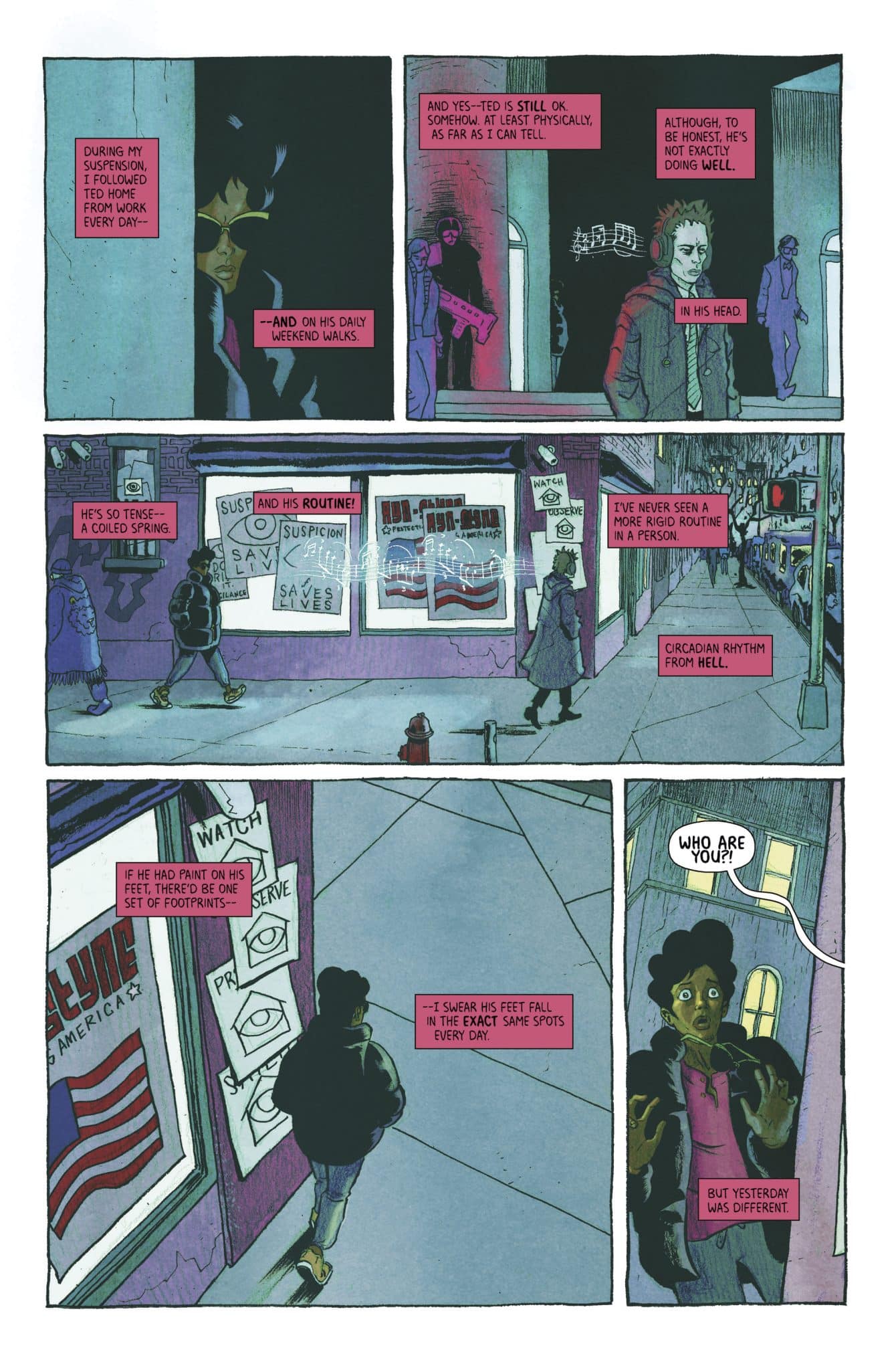 After the explosive conclusion to issue 1, Ted confronts Sarah and confesses that he believes his workplace, Ayn-Styne, is overrun with aliens engaged in a nefarious plot. Seeing that he needs friendly support, she commits to helping him investigate…without confessing that her job is, in fact, to spy on him. Her interest is piqued, however, as Ted unexpectedly uncovers evidence of a massive conspiracy deep within the bowels of the massive Ayn-Styne building. Meanwhile, on the other side of the world, journalist Kyle begins to interview the mysterious trillionaire–and Ayn-Styne founder–Noah™.