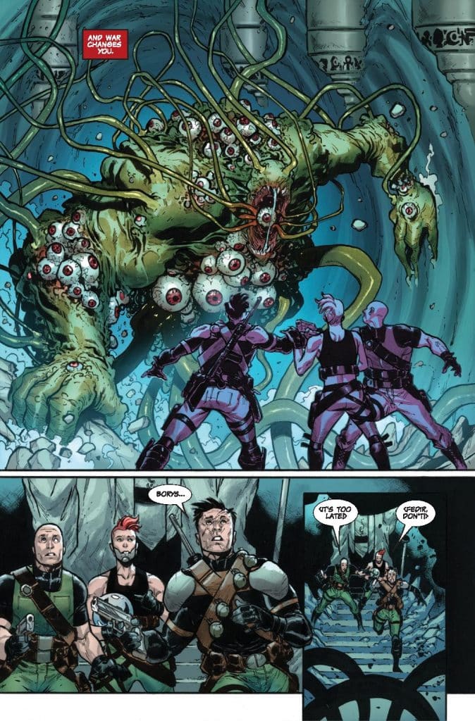 DOOM’S SECRETS EXPOSED! The doors of Doom’s Dungeon have been thrown open, and his darkest secrets are unleashed! As Red Hulk’s surviving soldiers are infected by the mutant horror known as WHISPER, will Red Hulk be forced to KILL THEM before they condemn the entire planet? Meanwhile, the Hammer of Treachery and the Eye of Khonshu empower and punish all who try to wield them! What will happen when an Asgardian-cursed Hydra agent faces Wakandan agent UMBRA, empowered with the mysterious SKULL-SHAPED HERB? Many will die in this shocking conclusion… and the few who survive will not be the same!
